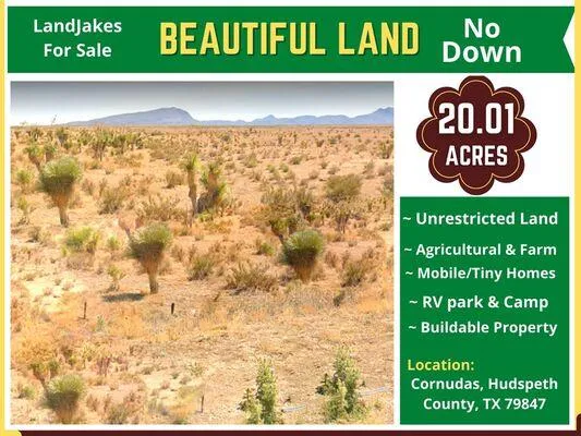 This 20.01 acres lot is great for anyone who is looking for a place to build a beautiful single residential land in Hudspeth, TX. A place to escape from the city noise and enjoy vacation or every weekend to refresh mind and soul and get ready for a weekday working day.