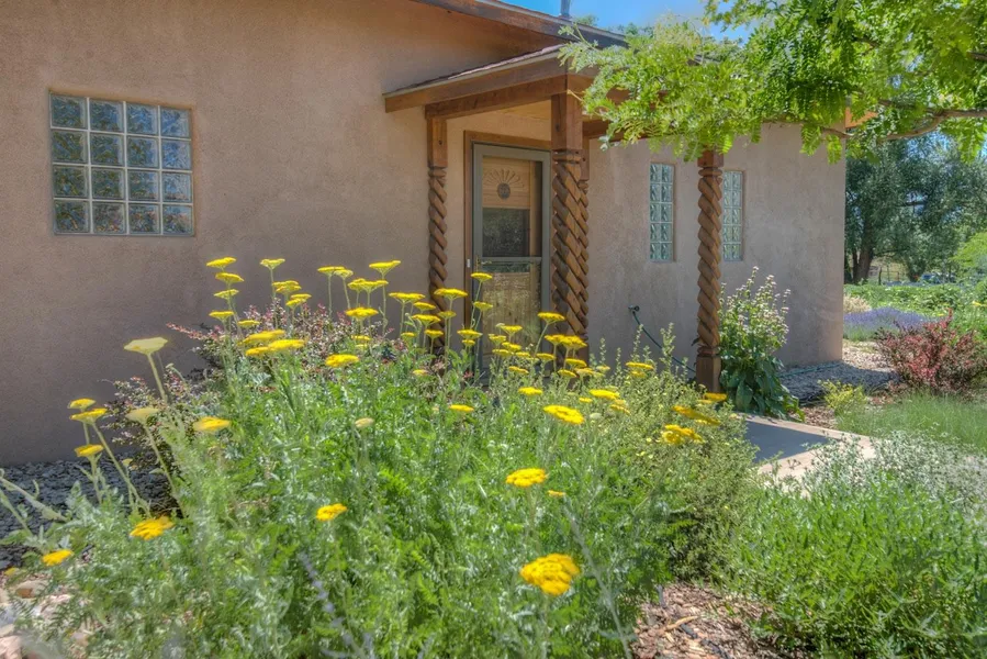 Enjoy the stunning mature gardens that surround this very high end, well kept property. The home features in-floor radiant heat under beautifully stained concrete floors; hand plastered walls leading to hand hewn vigas which adorn high ceilings throughout. The combination of copper and granite countertops create a warm, modern feel in the kitchen where sunlight pours through the perfectly placed windows. Beautiful en-suite master bedroom creates the sanctuary we all look for. The guest house allows your friends and family to enjoy privacy, all while staying connected by the incredible gardens. Evenings can be spent under the veranda while enjoying a fire in the Kiva fireplace or relaxing in the hot tub. Homes comparable to this are few and far between...don't miss it!