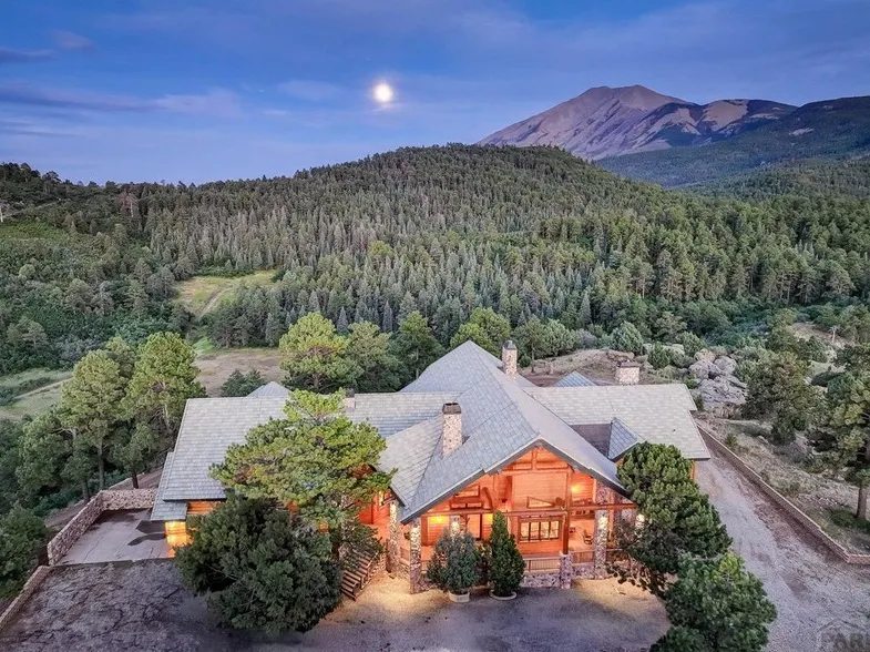 This 8,000+ sqft Log/Stone Mountain Retreat has no restrictions/covenants, is located in Southern Colorado near La Veta/Cuchara & has views of Spanish Peaks & Sangre de Cristo Mtn Range. Walk thru the Stone Entry into Great Room with Massive Timber Vigas, Vaulted Ceilings, and Stone Floors. The lodge features Stone Accents throughout & includes 5 stone propane Fireplaces. A Wet Bar adjoins the Great Room with a wall of windows & no homes in sight. You see Elk, Wild Turkey, Deer, or an occasional Black Bear surrounded by approx. 4000 acres of private ranch land protected by a conservation easement. The Main Lodge consists of 3 Bedrooms, 4 Baths with Library, Office, Wine Cellar, & Theatre. The Guest House has 2 Bedrooms, 3 Baths,a kitchen & a living room with a stone Fireplace as well as a 6 car garage with an RV Bay. The Main Lodge has an Oversized 3 Car Attached Garage with plenty of st...
