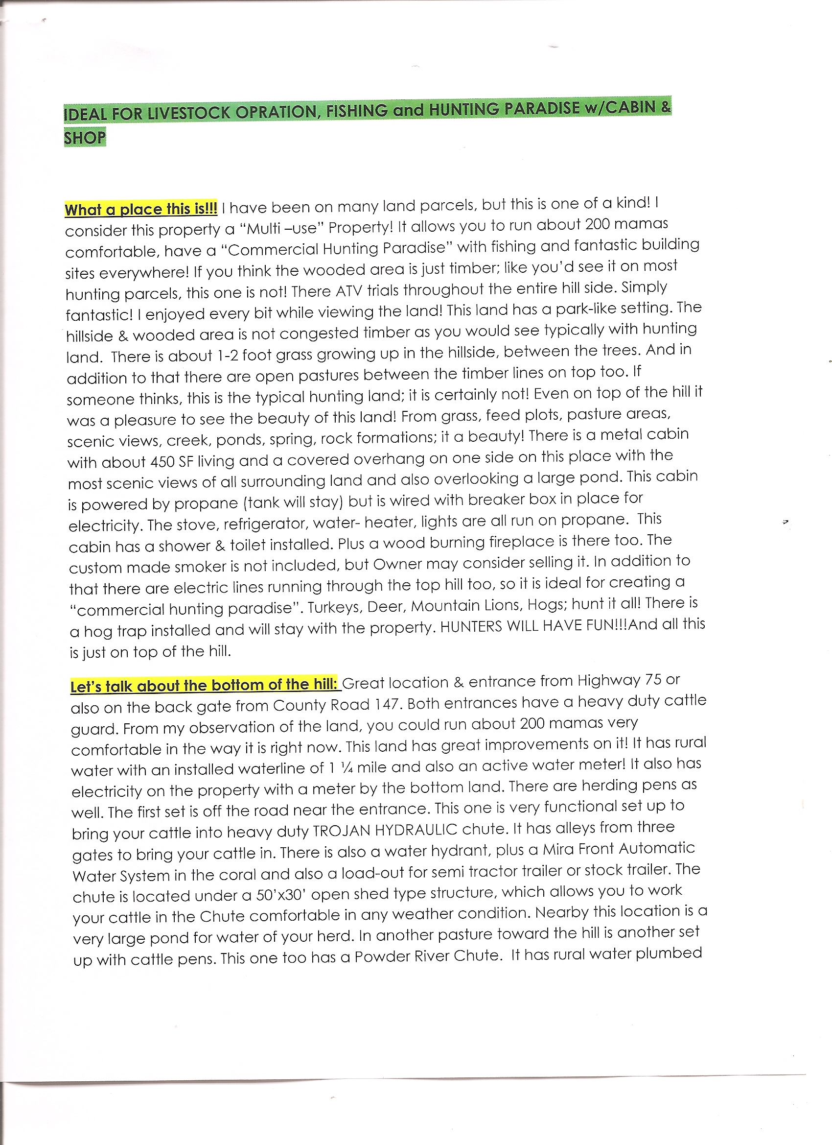 Lets talk about the bottom of the hill: Great location & entrance from Highway 75 or also on the back gate from County Road 147. Both entrances have a heavy duty cattle guard. From my observation of the land, you could run about 200 mamas very comfortable in the way it is right now. This land has great improvements on it! It has rural water with an installed waterline of 1 mile and also an active water meter! It also has electricity on the property with a meter by the bottom land. There are herding pens as well. The first set is off the road near the entrance. This one is very functional set up to bring your cattle into heavy duty TROJAN HYDRAULIC chute. It has alleys from three gates to bring your cattle in. There is also a water hydrant, plus a Mira Front Automatic Water System in the coral and also a load-out for semi tractor trailer or stock trailer. The chute is located under a 50x30 open shed type structure, which allows you to work your cattle in the Chute comfortable in any weather condition. The pens are constructed with heavy duty piping, welded together; very solid! Nearby this location is a very large pond for water of your herd. In another pasture toward the hill is another set up with cattle pens. This one too has a Powder River Chute. It has rural water plumbed to it too! On this location is the large, metal shop building. It consists of 26 gauge metal, is approx. 16 tall and has 4 sliding doors to make a 50 opening. The trench in which the doors slide is constructed with heavy duty metal and concrete. The interior beams are also heavy duty metal pipe, welded together with metal brackets. This building has dirt floor and is great for storing all your farm equipment. Also on this location are two 30 ton square overhead feed bins. Nearby this location you can cross the creek with your truck or ATV or go cross onto the custom built ATV Bridge! This structure consists of heavy metal pipe and is quiet unique! I loved crossing it and have not seen a structure like this before anywhere. There are numerous feed plots and hunting stands throughout. However, those will not stay. All moveable panels will not stay and any other personal items, such as feeders, temporary set-up panels, equipment, smoker, etc. The kitchen appliances and window air, plus wood stove in cabin will stay! The boat by the pond will not stay!