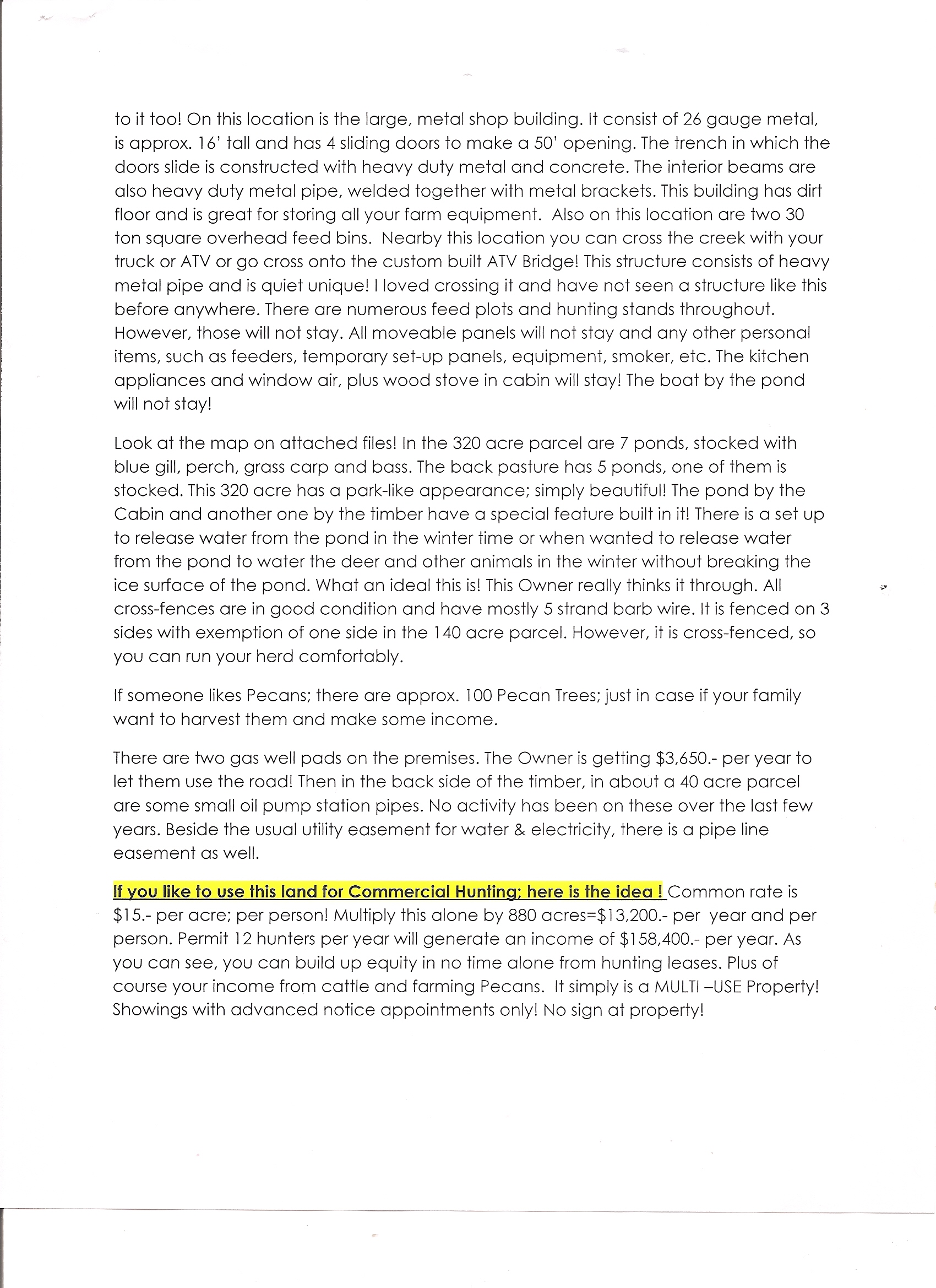 If you like to use this land for Commercial Hunting; here is the idea ! Common rate is $15.- per acre; per person! Multiply this alone by 880 acres=$13,200.- per year and per person. Permit 12 hunters per year will generate an income of $158,400.- per year. As you can see, you can build up equity in no time alone from hunting leases. Plus of course your income from cattle and farming Pecans. It simply is a MULTI USE Property! Showings with advanced notice appointments only! No sign at property!