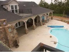 Door to the outside patio and pool area, plus another jetted tub on a covered patio with ceiling fans and lights above! The fun part on this feature is: you can relax in the jetted tub and overlook the land with scenic views.