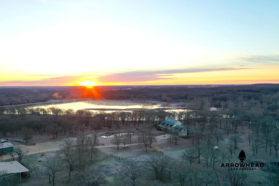 If you have ever dreamed of living in a gorgeous, custom home overlooking your very own private lake, here is your chance to fulfill that dream. This one-of-a kind farm is truly something special. The 5 bed 3 1/2 bath home sits down a long driveway and is surrounded by towering oak timber. As you walk in the front door you will notice a large living area and a staircase leading to the 4 bedrooms, 2 bathrooms, and movie theater that are located on the second level. The downstairs master bedroom offers loads of space, a walk-in shower and closet, large bathtub, and double doors that open to your incredible back porch. The beautiful kitchen is open to the living area and has enough room to prepare meals for the whole family. The area above the garage contains a 600 sq. ft. space that can be used for an office or extra lounge area. On those nice Oklahoma evenings you will be entertaining family and guests with the amazing outdoor living area that overlooks your very own lake. This lake is approximately 42+/- acres of prime fishing, waterfowl hunting, and is even big enough for spending hot summer days on your boat. If you are interested in grazing cattle and/or having a few farm animals, there are 3 metal barns and several fenced in areas already in place near the home. If the private lake and gorgeous custom home don't already take your breath away, the 614 +/- acres of phenomenal hunting acreage might just do the trick. Throughout this farm there is a variety of hardwood timber including massive pecan timber in the creek bottoms below the lake, and beautiful oak trees that cover the ridges and hilltops. This timber opens up into multiple large clearings that could be utilized as food plots for the large herds of deer and the hundreds of turkeys that call this farm home. It is absolutely a dream property for the avid outdoorsman and is large enough to manage exactly how you like.