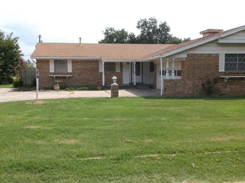 3 bed 2 bath brick house with central heat and air, an open porch, and a fire place.