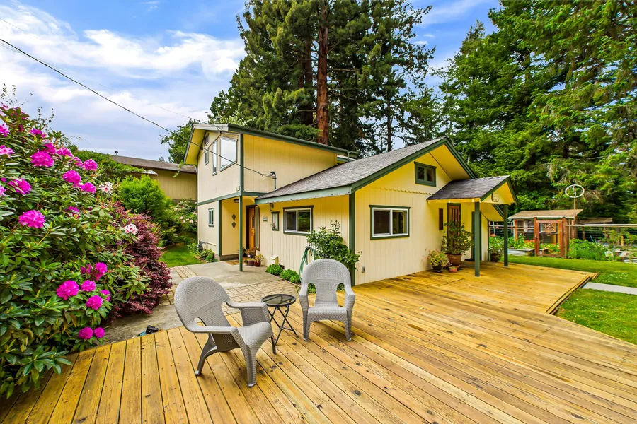 Welcome to a one-of-a-kind, bright, and spacious home. With three bedrooms and two bathrooms this house is perfect for a your group or those who love to entertain. Enjoy the open floor plan downstairs where the living room seamlessly flows into the dining and kitchen area. Lots of natural light fills this home from multiple sky lights and large windows creating an inviting and warm environment. Step outside to enjoy the private deck and large yard with fenced garden that keeps out deer. Plants are watered with a four-zone drip irrigation system. Across the deck you'll find a large garage with plenty of space for projects and storage and a bonus room, with bathroom and kitchenette, for guests or in-laws. Plus, with a private driveway parking is always available.