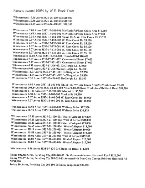 This listing includes 40 parcels of varying sizes from 2.07 acres to 598.77 acres. The listing is primarily in Humboldt County although 3 large parcels are in Pershing County. These parcels are priced based on access type, proximity to electricity, size of the parcel. Please see the attached parcel numbers, prices, and maps to find what you are most interested in. Buyer is responsible for determining the costs of bringing utilities to the property. Century 21 Sonoma Realty and/or it's agents are not responsible for the quality or quantity of water source on the property.
