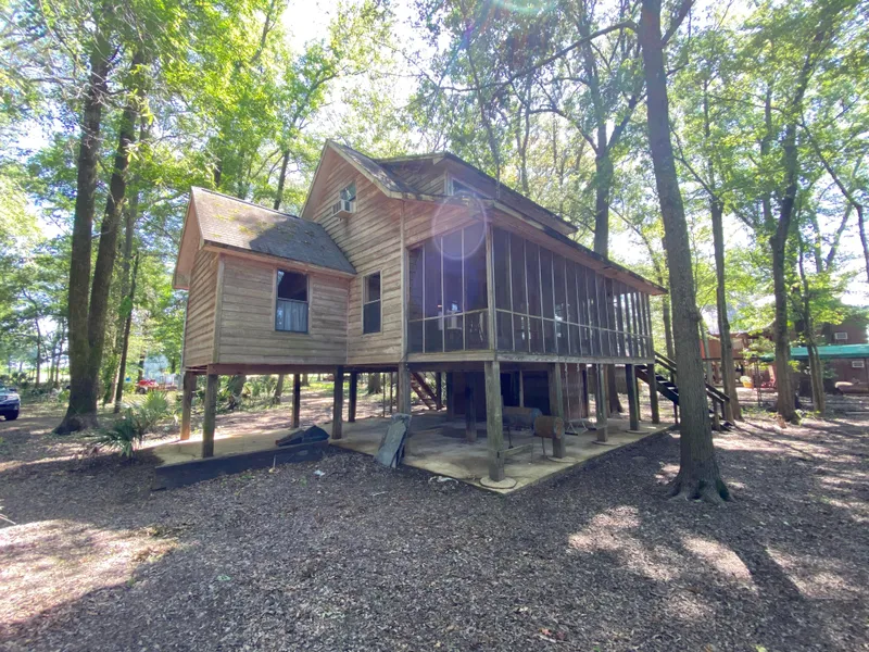 Elevated 2 story cabin contains +/- 1287sf of living area with 3 bedrooms, 1 bath and large front screened porch