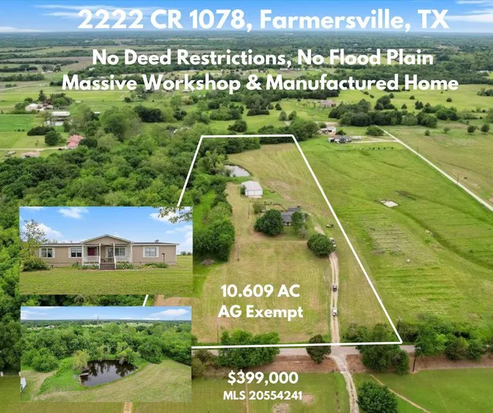 Opportunity abounds with this fantastic Farmersville TX USA parcel positioned on 10.609 acres. This is Texas and you have choices, you are ready for immediate occupancy or this may be your perfect investment opportunity. The home is a 3 bedroom, 2 bath, 2016 square foot, 1993 Elliott Solitaire doublewide manufactured home. The land boasts no flood plain, no deed restrictions and is outside of the Farmersville ETJ. The impressive workshop is 60x40x12 with dual sliding 15x12 doors, concrete floors, electric and an office. Enjoy AG exemption and a big pond all within Hunt County and desirable Bland ISD. Location is important and you are minutes to downtown Farmersville, convenient to Greenville and about 40 minutes to McKinney. The soil is mostly Hopco Silty Loam Clay which is rated for intense cultivation. A new survey is in hand. Information is deemed reliable; however, Buyer should perform due diligence.