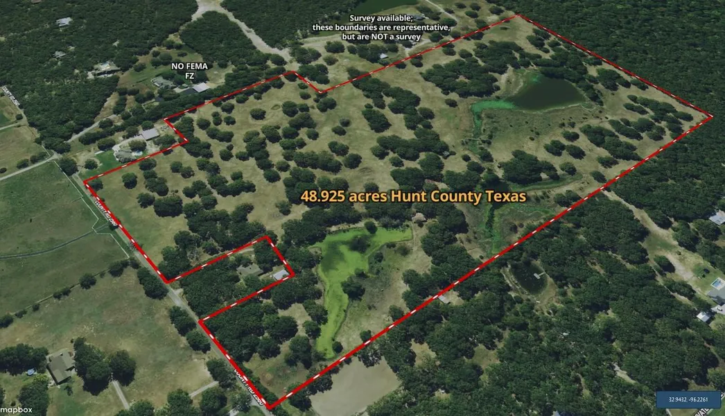 48.925acres in a high end burgeoning area of Union Valley, Royse City just east of Rockwall & Dallas, SW of Greenville & L3, with proximity to I30 and FM Roads. Appr 900' of road frontage; Surrounded by large homes on large lots, this would be a magnificent Texas estate, mid to high end residential development, or stupendous buy and hold property. 3 large ponds 1.5ac, 1.3ac, & .75ac pond; towering oak, pecan, and rolling terrain. Ag status; No fema Flood zone...