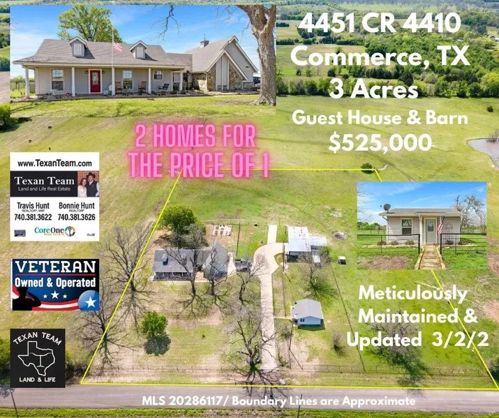Back on market due to no fault of seller. Look, mature pecan trees. This is not a gentleman's ranch, because in TX anyone can own a ranch. Bottom line, this is a Texas mini-ranch, on 3 acres, with a meticulously maintained and updated home, plus a fantastic guest house, plus a respectable barn for your equipment, all in gently taxed Hunt County. Look across the street, what do you see, nothing but an open pasture. Once inside you will appreciate the new flooring, stone fireplace and sparkling kitchen complete with granite and tall sturdy cabinets. If you want privacy while being convenient to Greenville, Commerce and an hour to Dallas, this may be your perfect piece of TX. The guest house is what you need for your Mother in-law, office, or AirBnB. Fenced parcel is complete with a chicken coop, raised garden beds. Conveys with kitchen appliances, washer, dryer, and a 1962 Ford 2000 tractor. Information deemed reliable, buyer should perform due diligence. Graphic boundary is approximate.