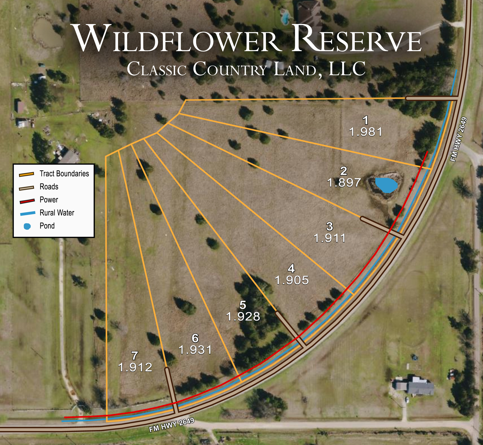 Wildflower Reserve is located in Hunt County. This gorgeous property offers 7 tracts of land, ranging from 1.89 to 1.98 acres, for sale in Lone Oak, Texas. Each tract comes with power and water available, providing the perfect opportunity to build your dream home and enjoy rural living. This property is conveniently located a little over an hour from Dallas and Frisco, TX.