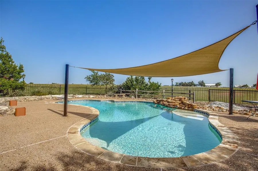 Beautiful farmhouse located on 39.25 acres of land! Conveniently located 45 minutes from Dallas and near I-30 and L-3 Harris. This 4 bedroom, 2 bathroom home with 2,027 square feet of living space has many amazing features! The farmhouse has an updated kitchen opening up to the dining area, master bedroom suite with a view of the pool, luxury vinyl plank flooring, a corner fireplace in the living area, a covered wrap around porch, oasis saltwater pool with a waterfall in the backyard perfect for entertaining, a detached oversized 3 car garage with a workshop area, pickleball court and wrought iron gate entry. This property is fenced and cross fenced with 3 barns, a 1 acre pond and an ideal set up for your homesteading dreams, or weekend getaway!