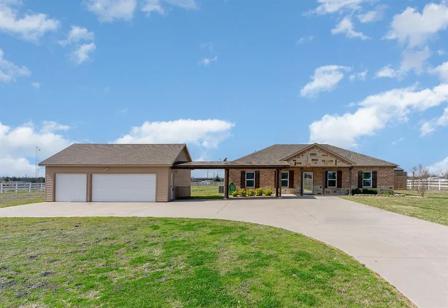 A paragon of modern living wrapped in the serenity of country life. Nestled on two fenced acres, this exquisite home boasts a perfect blend of luxury and comfort. The heart of this home is the open great room, seamlessly integrating the living area with a gourmet kitchen. Cooking enthusiasts will revel in the kitchen's high-end granite, rich cabinetry, a majestic center island offering ample seating, and a state-of-the-art dual-fuel range. A built-in buffet with a wine rack enhances the space, doubling as a chic coffee bar. The owner's suite is a sanctuary of sophistication with a lavish bath, while two additional bedrooms offer privacy and style. The outdoor space is elevated by an enclosed sunroom, extensive patio, 12'x24' workshop with electric, AC and heat, a greenhouse and large storage bldg. Modern comforts include plantation shutters, LED lighting, efficient windows and storm door...