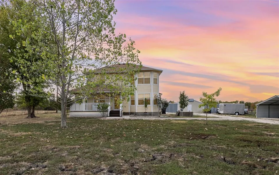 Your personal country retreat! Explore this charming two-story modern farmhouse built on over 10 AG EXEMPT acres. A wrap-around front porch and double-stacked bay windows offer a picturesque country vibe, with views of wide-open pastures and wooded acreage. Inside you'll find LVP flooring, crown moldings, generous room sizes & plenty of storage. There are two large living areas, both filled with natural light. Outside, expansive cross-fenced pastures, loafing sheds, and a livestock pen with shelter make this property ideal for small-scale ranching. Two commercial-size greenhouses, one heated, offer the perfect set-up for growing plants & flowers. A 20x24 workshop with electricity could easily convert to a barn or stables. Enjoy quiet walks through the wooded 1.5-acres, complete with a walking trail and bridge. Recent updates include a 2018 roof and 5-ton heat pump. Located in the highly rated Caddo Mills ISD, this property is a true country retreat just minutes from city conveniences.