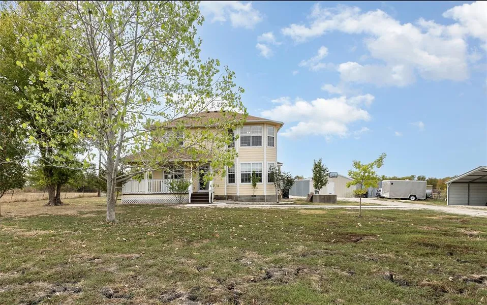 Your personal country retreat! Explore this charming two-story modern farmhouse built on over 10 AG EXEMPT acres. A wrap-around front porch and double-stacked bay windows offer a picturesque country vibe, with views of wide-open pastures and wooded acreage. Inside you'll find LVP flooring, crown moldings, generous room sizes & plenty of storage. There are two large living areas, both filled with natural light. Outside, expansive cross-fenced pastures, loafing sheds, and a livestock pen with shelter make this property ideal for small-scale ranching. Two commercial-size greenhouses, one heated, offer the perfect set-up for growing plants & flowers. A 20x24 workshop with electricity could easily convert to a barn or stables. Enjoy quiet walks through the wooded 1.5-acres, complete with a walking trail and bridge. Recent updates include a 2018 roof and 5-ton heat pump. Located in the highly rated Caddo Mills ISD, this property is a true country retreat just minutes from city conveniences.