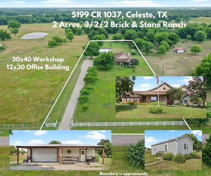 Are you looking for a few acres, need more space to telework, or want to enjoy a fantastic workshop, then welcome home. This brick and stone ranch boasts 3 bedrooms, 2 bathrooms, on 2 acres. Functionality is evident from the split bedroom layout, to the spacious kitchen with a passthru nook to the dining room, to the pellet stove in the den. The kitchen is wide open and has so much room for activities. The fenced property has pecan and producing fruit trees as well as a vineyard. You will appreciate the massive 30X40 workshop, with a 10 foot overhang, which can accommodate 3 vehicles and has electric, water and HVAC. Additionally, there is a 12x30 portable office building that is complete with electric and HVAC. Thus an easy upgrade to a tiny home or use as office. Location is important and you are minutes to downtown Celeste, close to Farmersville, convenient to McKinney and 1 hour to Dallas, while positioned in reasonably taxed Hunt County. Information deemed reliable, buyer should perform due diligence. Graphic boundary approximate.