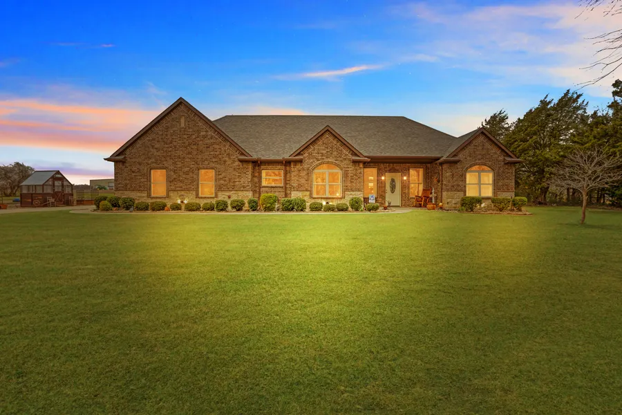 Better than new, one owner, custom built, brick and stone home, featuring 4 bedrooms, with an office (which can easily be a 5th bedroom) and a fantastic oversized 2.5 car workshop with epoxy floors, all on 1.5 acres, where your chickens and animals are welcome. Location is important and you are minutes to State Hwy 380, which is your route West to McKinney and East to Greenville, all while in Hunt County. The home features a chef-ready kitchen with granite countertops, breakfast bar, and walk in pantry. Retreat to the primary bedroom, with a sitting area, and ensuite bathroom with granite countertops, a relaxing jetted tub, separate shower, double vanities and walk in closet with built ins. Boasting upgrades you would expect, you will appreciate the engineered hardwood floors, ample storage, granite in all the bathrooms, round countertop edges and West facing remote window shades. Rest a...