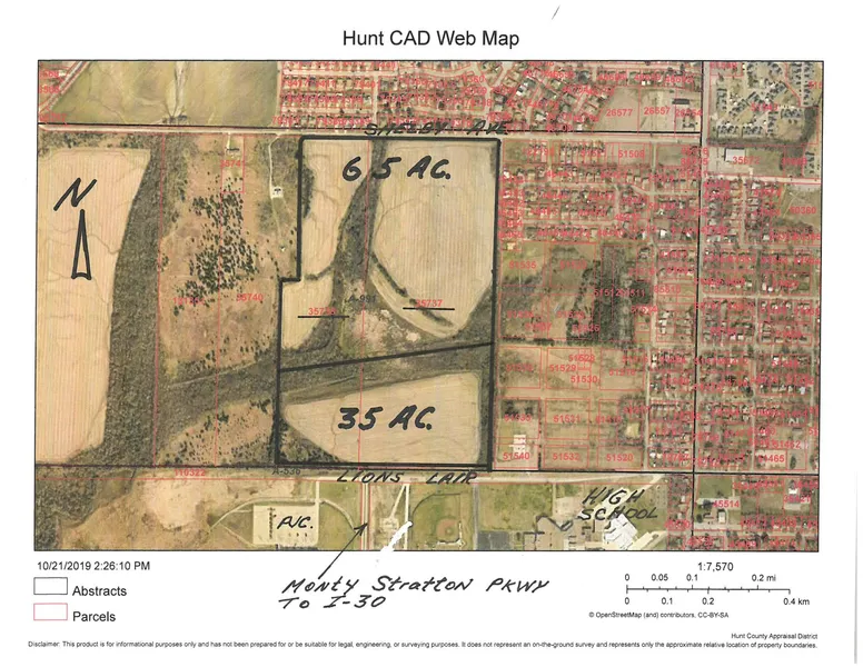 A large well located tract with development potential and can be sold in one tract of divided for two tracts. Street frontage on north and south boundaries. Adjacent to large residential area on north and east, and across street from the High School on south boundary. Existing plat allows new street on east boundary. Presently cultivated under farm lease. Significant surface water flow through one area, which can probably be used for controlled water retention space in conjunction with development, or possibly a lake. Consider selling 35 acres fronting Lions Lair at $395,000 or 65 acres fronting Shelby Ave. at $405,000, or total tract at $800,000. See attached aerial photo. Under AG tax designation.