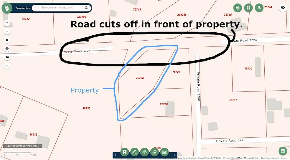Research Parcel InformationFor this property, it is best to look up the road on Google Maps, as the property doesn't exactly have a street number. Lookup Private Road 3724, Quinlan, Texas and follow the map.