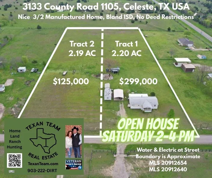 OPEN HOUSE SATURDAY 2-4 PM. Presenting a fantastic 2.20 acre parcel, with NO Deed Restrictions, NO Flood Plain and a respectable, clean and bright 3 bedroom, 2 bathroom doublewide manufactured home. The property is in the desirable Bland ISD in Hunt County. Location is important and you are minutes to State Highway 380 which is your corridor East to McKinney, Sherman and DFW and West to Greenville. The Clayton Southern Star was built in October 1996, placed in service in 1997 and is recognized as Real Property. All utilities are in place and there is an outbuilding and a double car port with a connected storage room. This is Texas and you have options, move right in, hold for investment or this may be a great rental property. Graphic boundary is approximate and the subdivision is conceptual. Information deemed reliable but Buyer should perform due diligence. The adjacent 2.19 AC property...