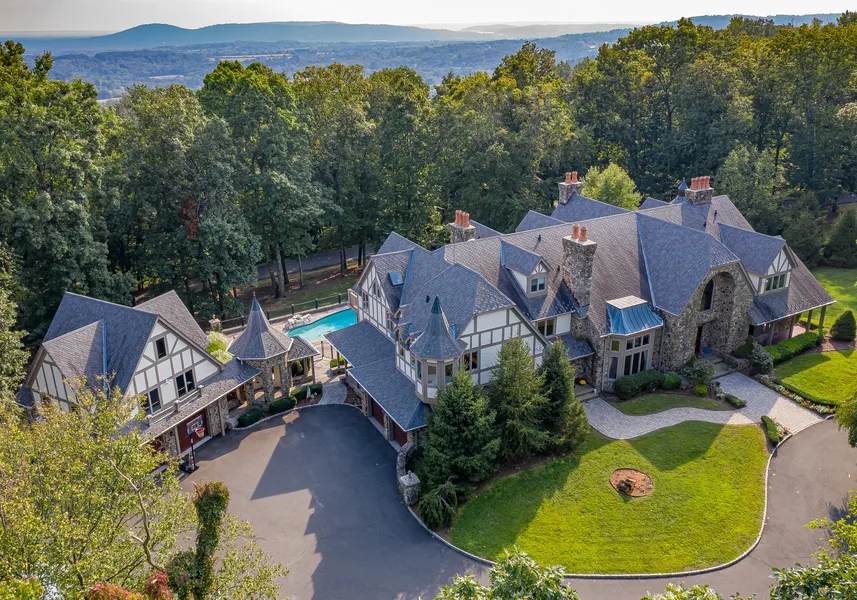 Overlooking some of New Jersey's most scenic countryside, this European-inspired manor is a showcase of superlatives and gracious living. A private road ascends to the manor's 9+ acre setting. An oasis of manicured grounds, lush landscaping & sun-oriented terraces host a free-form pool, spa, & dining enclave with fireplace. The renovated kitchen showcases a coffered ceiling, double-thick granite and quartz counters, custom cabinetry, & robust Sub-Zero and Wolf appliances. The walk-out lower level opens to the pool terrace from the spacious media room. Accompanied by 4 heated garages, 2 attached & 2 detached, the latter with unfinished apartment above, a full house generator, security system, and 9 fireplaces. Located only minutes from major highways, & 35 minutes to Newark Liberty Int'l.