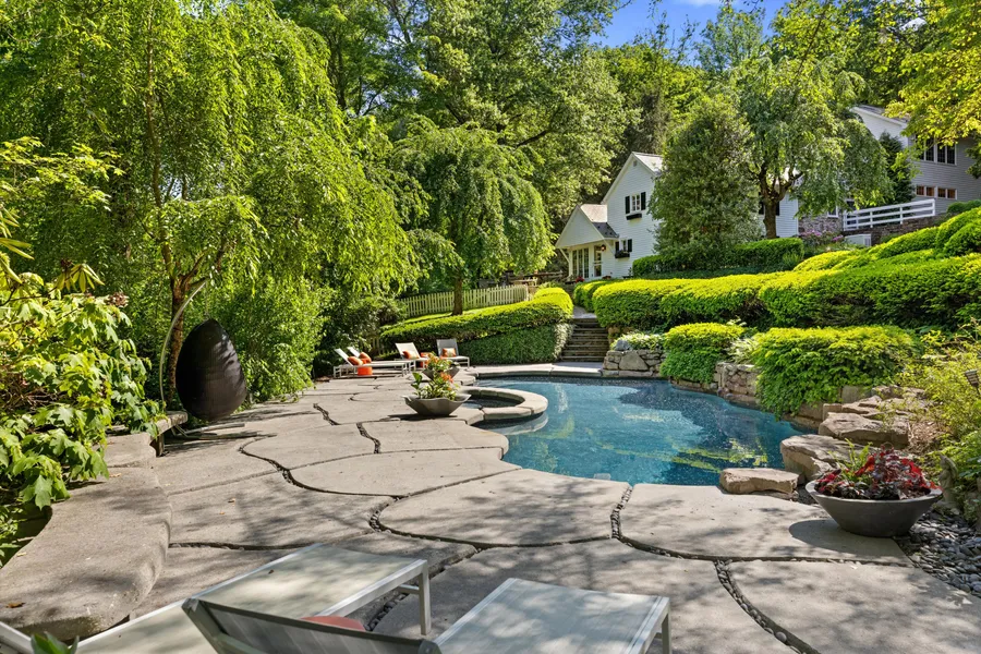 Just an hour’s drive to NYC and Philadelphia, the idyllic Delaware Township has long been an escape for weekend homeowners and commuters alike, including the Roebling family. Scion John A. Roebling was the civil engineer behind the Brooklyn Bridge and numerous other suspension bridges. And while the area has its fair share of historic homesteads, Red Bridge Farm, once home to a Roebling heir, is unique among them. Nestled on 16+ acres along the serene Wickecheoke Creek, and featuring terraced gardens, a saltwater pool, all-weather tennis court, pool house w/ spa shower and wet bar, this historic property has been artfully transformed into a soothing, modern-day retreat that preserves the old world feel of a 19th century stone farmhouse. And feels worlds away from the city’s bustle. Comprised of a 4-bedroom, 3 1/2 bath fieldstone main residence, stone writer’s cottage with fireplace, and separate caretaker’s apartment (above a heated 2-car garage), the property is ideal for hosting family and friends, while affording everyone a welcome privacy. Originally built in 1805, Red Bridge Farm was home to two generations of the storied Rittenhouse family (considered the founders of America’s paper industry). The estate has historically been used as a weekend escape by its owners, whose number (while relatively few) included philanthropist, Mary G. Roebling (America’s first female Bank owner). In the 1980s, the owners commissioned a modern addition by celebrated architect Manuel Fernandez-Casteleiro (designer of Battery Park City and Soho’s Dean & Deluca) featuring expanses of glass that allow residences to enjoy the verdant grounds year-round; and a custom kitchen designed to gourmet chef standards of efficiency and access. Red Bridge Farm’s sense of bucolic isolation resonates more powerfully than ever.