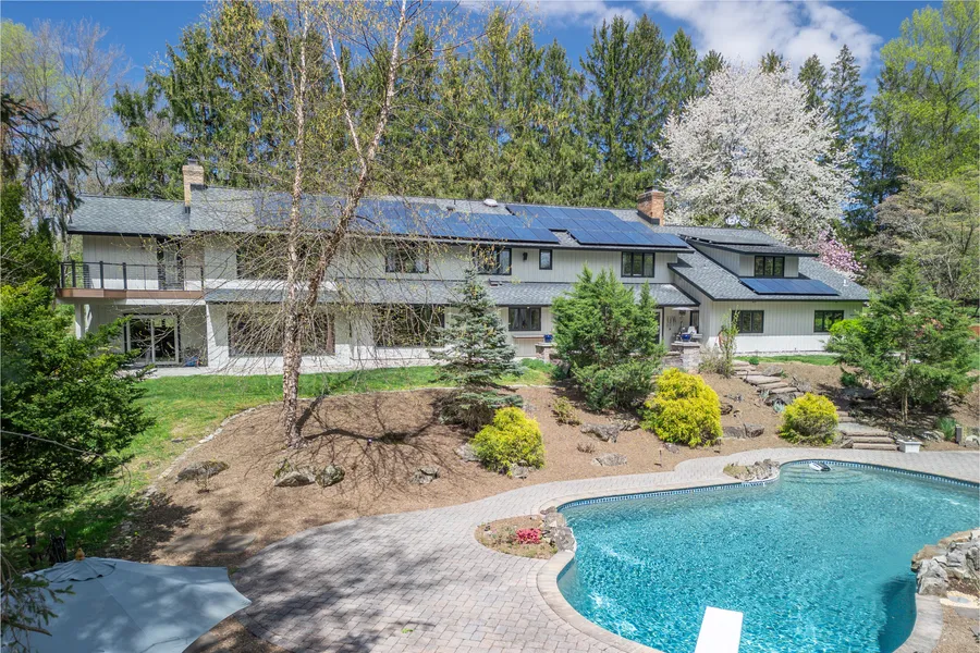 This retreat-like hobby farm property nestled in a secluded setting on a cul-de-sac in a highly-desirable neighborhood features architecture appropriate to a broad range of decor from traditional to modern with plentiful windows, glass sliders, patios, and decks overlooking beautiful views of the landscaped property. Features include a large primary bedroom with four closets and a recently-renovated en suite bathroom, updated eat-in-kitchen with center island adjacent to family room with wet bar area, large second-floor laundry room, several options for home office spaces, full bath and powder room on first floor, and a back staircase near the garage and kitchen. Paver patios connect the home with the Gunite-style inground pool with waterfall, landscaping, and pool house which define spaces for outdoor dining and recreation. A two stall bank barn has additional room for tractor/hay/car storage and is complemented by adjacent post-and-board fenced paddocks, and access to the Tewksbury Trail System including direct access to the 180 acres of Christie Hoffman Farm Park. Additional updates and improvements to the home include systems, roof-mounted solar system, and high-efficiency boiler (gas service in the street). Exterior landscaping includes cherry, pear, and apple trees. Conveniently located near shopping, schools, parks, and commuting highways, while nestled in a neighborhood and serviced by highly-rated schools.