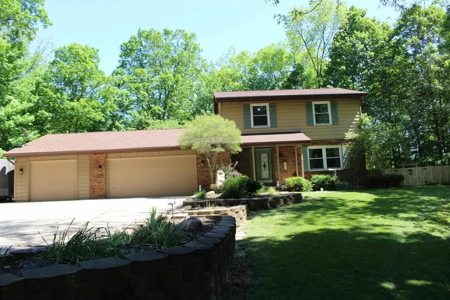 Beautiful 4.6 acres of woods with the home sitting above the creek.. This well cared for home has over 2,000 sq. ft., 3 bedrooms, 2.5 baths, a Living Room, Family Room and a Den with Hickory built in office space and a secured area to store your guns or valuables. The Family Room has a gas fireplace and is open to the custom kitchen. Brazilian cherry hard wood floors, Corian counter tops, stainless appliances and a new induction stove top with a vent system that comes up with the push of a button and lots of storage! Don't forget the gorgeous view outside the kitchen windows. The 3 bedrooms are upstairs and the master has a walk in closet and a full bath with a walk in shower. The furnace and central air were new in 2019. The home has a 3 car attached garage plus a large pole building with concrete floors. The laundry area has been in the half bath but this owner moved them into the garage. All kitchen appliances stay and that includes the laundry, the deep freezer and the garage refrigerator too. This 4.6 acres is mostly wooded. Access the lower level from the steps or from the dirt road in the woods just past the driveway. It turns off to the right once in the woods. this property goes to about the tree that says NO TRESPASSING KEEP OUT. Look for the orange surveyor flag in the trees. Hot tub is working at listing time but is not guaranteed.