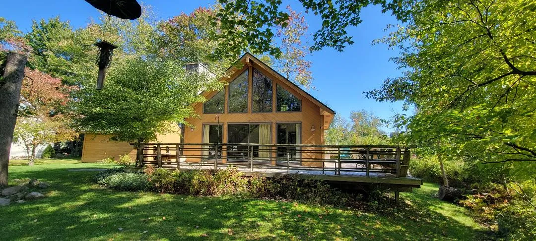 Well cared for Chalet located in a private wooded setting, walking distance to a gorgeous sugar sand deeded beach easement! As you enter this 3 bedroom home you will notice a open layout that boast a beautiful vaulted ceiling with gorgeous windows and over sized door wall. Natural wood burning fireplace and spacious living room opens into the homes dining and kitchen that offers a snack bar. Two bedrooms along with a full bath are located on the main level and spacious sleeping loft offers beautiful views into the front yard. Stunning wrap around deck will allow you to entertain friends and family all summer long. This paradise is nestled on two wooded lots and offers a detached garage for all your year round toys. Sellers have installed a whole house Generac generator and the homes furnace has been updated as well! Deeded beach easement and park that offers tennis courts are walking dis...