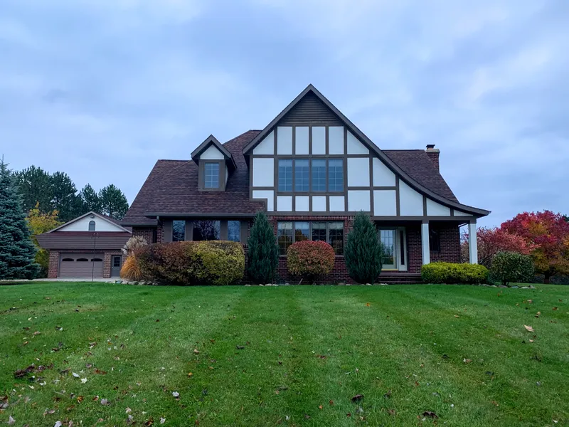 Beautifully custom-built English Tudor home with 2,749 sq ft located just off Scott Rd. This stunning setting offers 12.59 acres with a stocked pond, mulberry trees, walking trails and plenty of wildlife. Nice kitchen with oak cabinets, snack bar and gorgeous views of the yard. Formal dining room and spacious living room 19' x 25' with oak flooring, wood burning fireplace, cedar cathedral ceiling and wall along the fireplace, corner desk, large windows and double French doors that lead to the patio overlooking the pond. Next to the foyer is a half bath and oak staircase. The upper level has 3 bedrooms, one with an adjoining full bathroom and the second bedroom has double closets. The master bedroom measures 14' x 18' with vaulted ceiling, walk in closet and full master bathroom with jetted tub. Full unfinished basement with 1,435 sq ft, laundry room and plenty of room for extra storage. Attached 2.5 car heated garage, 12’ x 16’ storage shed and 25’ x 30’ detached garage with on demand hot water heater, overhead loft storage and full walkout basement. There is a barrier gate at the entrance of the driveway, paved driveway and geothermal heating and cooling. This is a beautiful setting, enjoy the privacy and outdoors. Call to set up a showing.