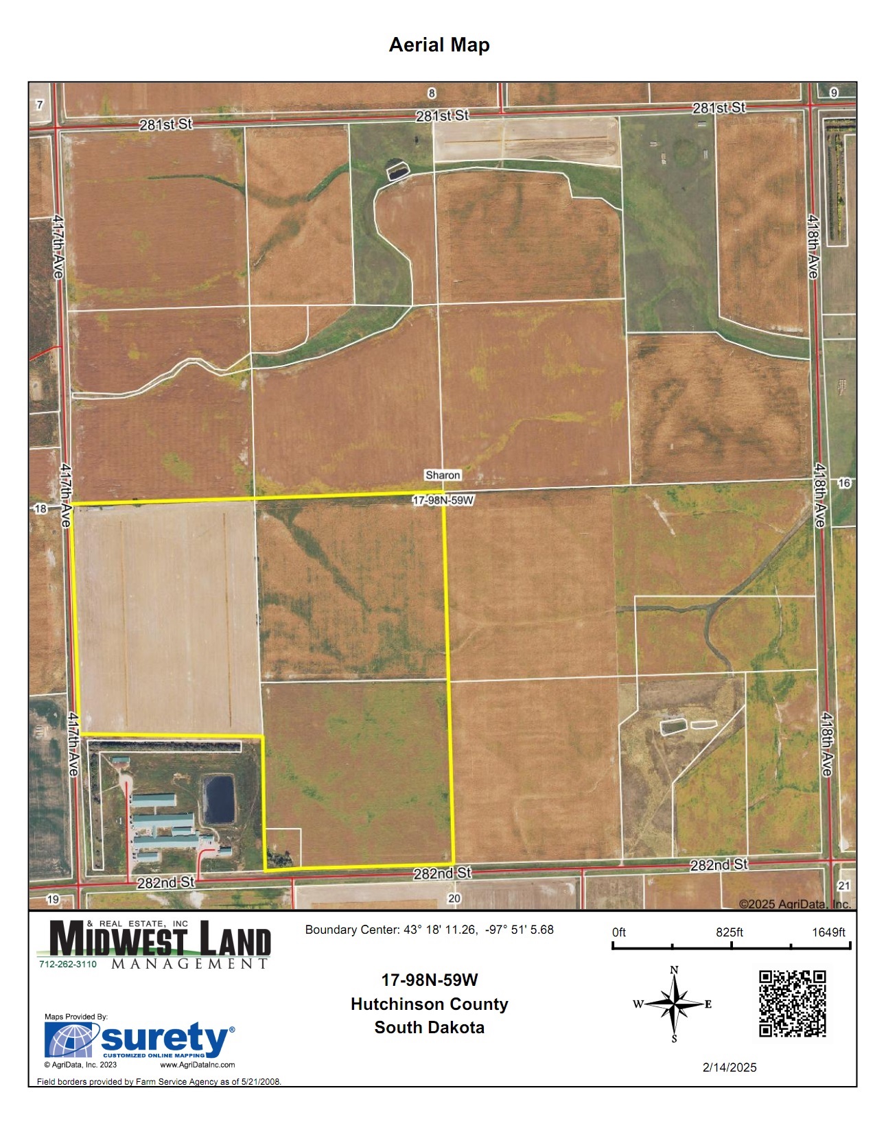 This 132-acre farm in Sharon Township, Hutchinson County, South Dakota, presents an excellent opportunity for both farmers and investors. Located just 5 miles north of Tripp on Highway 37 and 7.1 miles east on 282nd Street, this property boasts productive soils, including Clarno-Bonilla, Prosper-Stickney, Tetonka, Whitewood, and Stickney-Dudley, with a Surety/Agridata Productivity Index of 84.2. With 124.75 acres of cropland, the farm features a corn base of 41.67 acres (PLC Yield: 130) and a soybean base of 18.45 acres (PLC Yield: 42), making it a strong income-producing asset. Priced at $1,300,000, this is a solid investment in South Dakota's fertile agricultural landscape. Dont miss your chance to own high-quality farmland in the heart of South Dakota!