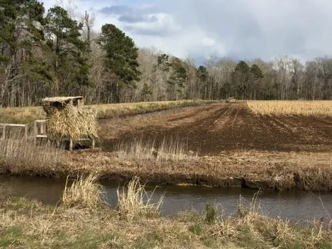 This property is 45 acres, with three seperate ponds totaling 35 acres. There is an eight inch well, with power, plus the surrounding canals are fresh water, so flooding is not an issue. The ponds can be flooded separately and are surrounded by woods on three sides, offering plenty of protection and privacy. The 10 acres in the front will serve as a buffer from the adjoining farm.