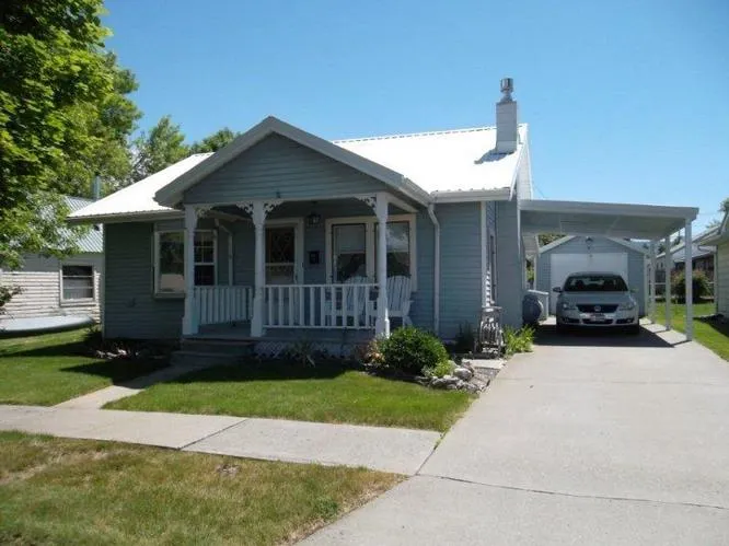 Well taken care of bungalow on the south side of town. Home has been completely remodeled and rewired with a new foundation. Garage has been converted into a shop. Back yard has a chainlink fence an apple tree, plum tree and many flowers. The propane stove is new within the last 2 years. The home has a covered front porch and has a metal roof. Most of the windows are vinyl and vinyl siding. The home is in a commercial zone so could be converted to an office.