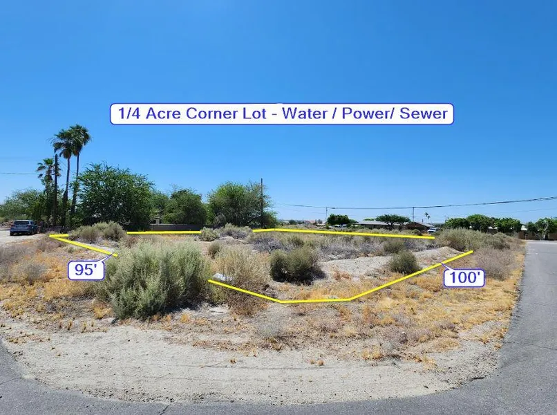 Boasting a prime location near hiking and four wheel drive truck trails, this 95 ft x 100 ft corner property is close to a quarter of an acre and is much larger than other lots in Desert Shores. All the utilities are to the property line including city water, power, and sewer and there is no HOA. It is zoned R-2 for single family structures and duplexes, making this a great investment property that is 5 miles to the Red Earth Casino, new development in Mecca, Indio and Palm Springs with stunning postcard mountain and lake views, while being in the new lithium corridor of Highway 86 leading to Lithium Valley lithium mining and new geothermal energy production and jobs. . For easy transformation from land to dream home or investment property including a manufactured home, this lot has city water, sewer, electricity, and cable all in place at the property line. Meters and hook-ups required. Perfect for a duplex rental, manufactured home or stick-built house!