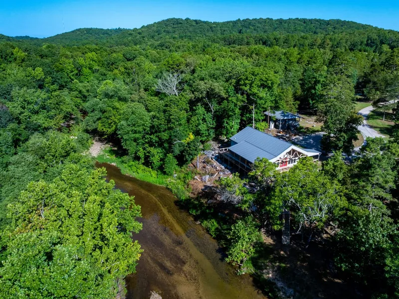 As you wind down the private easement and through the locked gate, you’re immediately immersed in pristine Ozark beauty. Sitting atop a bluff overlooking the crystal-clear waters of Poke Bayou, you’ll find a gorgeous custom-built main cabin and a second guest cabin both designed for comfort after a long day in the woods.