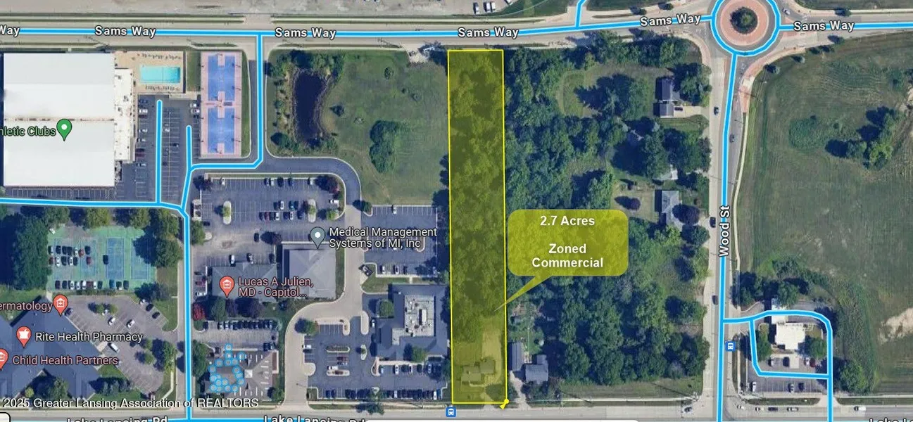 Price reduced!!! Much potential- Zoned commercial- 100ft of frontage on Lake Lansing Road, and 200 ft of footage on Sam's Way- red building is currently used as office space-not residence. 2.7 acres of wooded underdeveloped land-prime location with 2 road frontage opportunities near Wood St and Lake Lansing Rd. Survey is available, call the listing agent for details and showing.