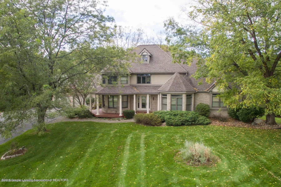 Stunning home in popular Chimney Oaks Subdivision! Located on one of the prettiest 2.7-acre parcel in the development with private wooded & pond views, custom designed with charm & quality throughout! The former developers own personal home was built to perfection! Over 3,618 sq. ft. above grade. Extensive dentil and crown molding & quality features throughout this magnificently decorated home along with numerous strikingly designed windows & leaded glass transoms! Enjoy 10 ft and 12 ft ceilings on the main floor, plus special archways! The 2-story open foyer with European limestone flooring leads to a column-flanked, great room with elegantly detailed gas fireplace.