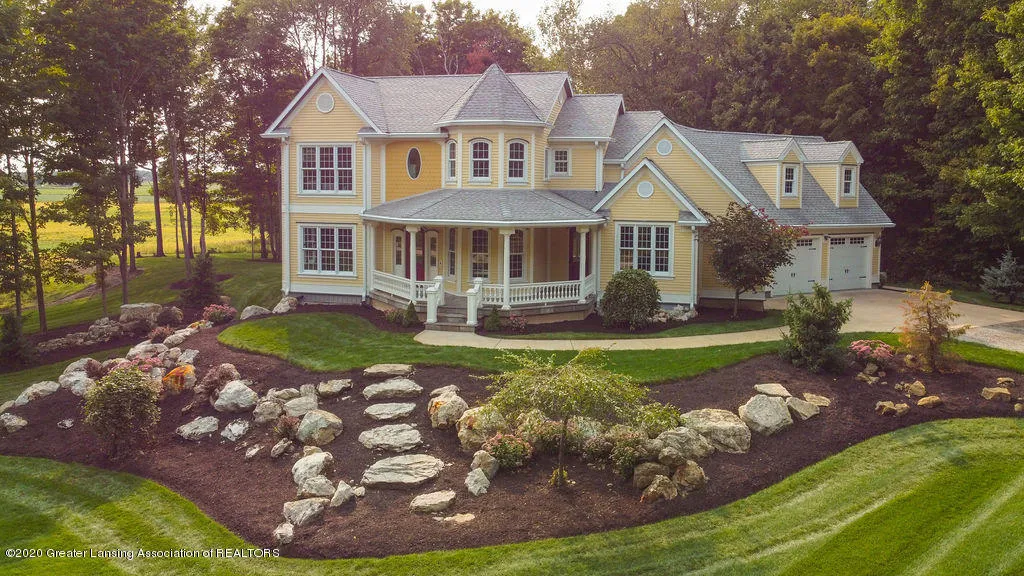 Mason - Stunning blend of superb home quality and over the top tranquil setting with this spectacular home offering on over 10 acres of land. Almost 4,500 sq. ft. of luxury with 4-5 bedrooms and amazing views in all directions. This custom-built gem has custom milled trim work throughout! 8 ft. solid interior doors. 9 ft. ceilings on each floor. Special hardwood flooring and high-end finishes throughout. Large wraparound front porch with special over-sized flagstone tiles. Watch the sun rise and enjoy the special custom landscaping with bolder accents. Lovely Cherry flooring, floor to ceiling windows, special alcoves, and bay windows with charm and character galore! Enjoy the formal living or piano room, main floor study, and over-sized great room anchored by a corner fireplace.