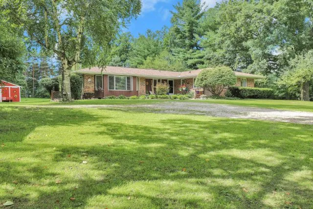 Welcome to your new home! This sprawling brick ranch home is situated on over 2 beautifully landscaped acres and features 5 bedrooms and 2 full bathrooms. The main level features a wonderful open floor plan, the updated kitchen features plenty of cupboards and cabinets, a dining room combo, a family room with a wood burning, two-sided, fireplace and lots of windows overlooking the gorgeous backyard. There is also a separate living room area with a wood stove. The main level also features a spacious master bedroom, bathroom suite, 3 additional bedrooms, and additional full bathroom. Finished lower level with recreational/family room and an office/bedroom. Features a large, detached garage and shed for additional storage. Cute play house in the back yard, too. Mature landscaping. Roof and kitchen redone within last 5 years. House is wired for a whole home generator. Minutes from a supermar...