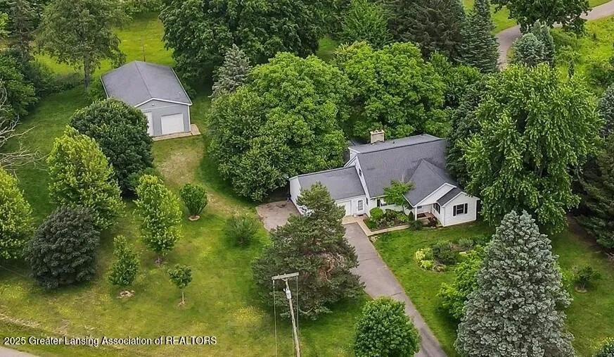 Welcome to 718 Hogsbeck Rd, Mason. This spacious Mid-Century 4 bed, 2 bath home sits on 2 acres and includes a 1,536 sq ft pole barn with 14 ft and 10 ft doors, cement floor, insulation, and heat setup. With over 2,300 sq ft of living space, the home features a newer kitchen, hardwood floors, a four-seasons room, living and dining rooms, fireplace, bay window, and a main floor primary suite. Large closets throughout and all appliances stay. Full basement offers excellent storage and potential for finishing. Two-car attached garage with dual entry access to the home. Outdoors, enjoy mature hardwood and fruit trees, a private patio with lighted pond, and beautifully landscaped grounds. Located less than 1 mile from the US-27 on-ramp, 2 miles from local dining, and 3 miles from downtown Mason. Don't wait to check out this property and all it has to offer. *Some pictures virtual staged, lot lines are estimated.
