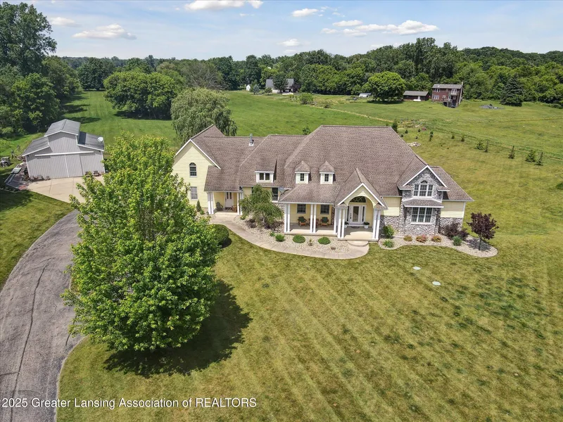 Welcome to 5056 Bunker Road, Mason. Impressive architecture, open, expansive spaces & volume ceilings. Approx. 5,456 sqft living space on 3.46 acres. You are going to love it. Great rm w/built ins/gas fireplace. An abundance of cabinetry in the expansive kitchen w/large sit up bar. Informal & formal dining rms. Dining rm could easily be a home-office. Primary suite w/door to private deck and a wow of a bathroom. Hardwood & tiled flooring. Walkout LL has room for everyone - gas fireplace, kitchenette, bath & a half, three bedrms plus office. Three seasons rm overlooks yard & above ground, heated pool. Barn (size: 32'x40'x12' & upper level est.12'x40') w/trex decking to the side, walkup loft. Attached garage w/walk up storage room. Level and room measurements estimates.