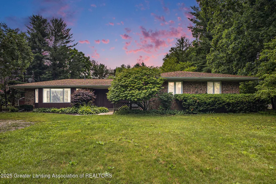 Situated in a picturesque country setting on a newly paved road, this expansive brick ranch spans over 3000+ square feet and features 5 spacious bedrooms and 2 ample bathrooms. Inside this stunning Mid-Century Modern home, you will find beautiful butcher block countertops, large walk-in pantry, a dual-sided fireplace, gleaming wood floors, fresh neutral paint, new carpeting, and a substantial four-season room equipped with a cozy wood stove for winter nights, providing ample space for all your needs. The basement includes a fifth bedroom or office, a large family room that has been recently painted and trimmed, a bar area, a laundry room, and extensive storage space. Additionally, the hot water heating system has been recently upgraded with a brand-new unit, and new water softener, ensuring peace of mind. Nestled on 2.25 acres within the desirable Mason School District, this property offers the opportunity to appreciate nature on the beautiful back deck or enjoy a bonfire at the fire pit. The property includes a large shed suitable for various hobbies or storage needs, as well as a generous two-car garage. This is an opportunity not to be missed.