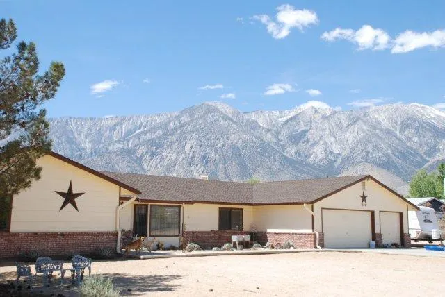 Everything you could ask for in the Alabama Hills! 4 bedrooms 3 baths plus a complete attached 1 bedroom 1 bath guest unit or mother-in- law quarters with a separate complete kitchen . Nice flowing floor plan. Kitchen has new counters, garden window and is open to the large informal dining area and roomy family room. There is also a formal living room and a formal dining room or office. Extras include skylights in the bathrooms and French doors off the family room leading to a large redwood deck with *Sunsetter awning and enclosed spa room. Master has walk-in closet and double sink bath with new counter top. Large laundry room/pantry area with direct access to the 3 car garage. Central heating, money saving pellet stove and 2 evaporative coolers. Newer high quality roof. Large 720 square foot barn with slab, roll up door and additional enclosed stalls. Fully fenced 4 acres w//fruit trees, complete RV hook-up and views of the Sierra. Horses are welcome. You're Gonna Love It!