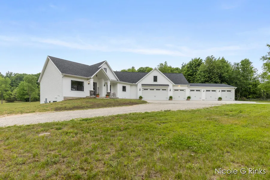 Stunning custom home on 18+ acres in Belding! This private retreat features high-end finishes, open living space, a large 3-season porch, and both a King and Queen suite on the main floor. The upstairs is ready to finish for added space. A 6-stall attached garage offers an insulated workshop, custom built-in cabinets, island, and room for all your toys. Walkout lower level has a separate entrance, kitchenette, living area, game space, 2 bedrooms, full bath, and a built-in safe room, and gun safe. Outdoors you'll find groomed trails, an apple orchard, and top-tier hunting for trophy bucks. Close to Whites Bridge for kayaking, nearby golf, and Double R Ranch. A rare find blending comfort, luxury, and recreation! Total square footage of living area is over 4,400. Schedule your showing today!