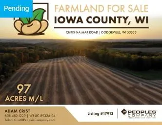 Peoples Company is pleased to offer 97 acres of prime farmland in Iowa County, Wisconsin. Located just minutes from Dodgeville, Wisconsin, and Highway 151, this highly productive farm comprises 76.58 FSA cropland acres with a Productivity Index (PI) of 67.6. Significant clearing of fencelines and trees has added approximately ten more potential tillable acres to the farm. The primary soil types are Palsgrove, Dodgeville, and Newglarus silt loam. This farm has consistently produced strong yields.