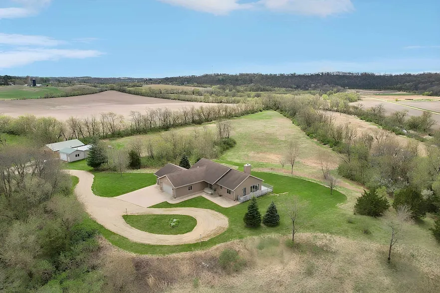 61-acre retreat with 3,000+ feet of water frontage on the Pecatonica River offers ultimate serenity and privacy. This one-owner, custom-built ranch features gleaming hardwood floors, an open-concept design, and peaceful country living. The kitchen includes a gas range, extra wall oven, ample cabinet space, and breakfast bar seating. Great room with vaulted ceiling and stone fireplace. Relax in the sunroom and watch abundant wildlife. Spacious primary suite with en suite bath and walk-in closet. Walkout lower level with second kitchen and rec room perfect for entertaining. Heated 3-car garage, 40x50 storage building, and 1,076 sq ft heated shop. Hunt, camp, fish, or kayak. 21 acres enrolled in CRP.
