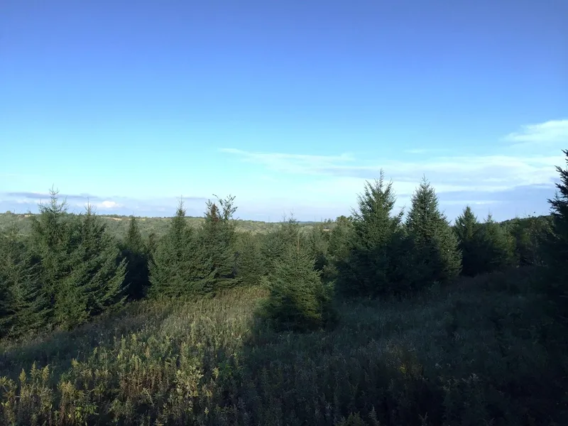 Originally a ridge top field, in 1995 it was planted in hardwoods and white spruce. Now the trees have matured and provide great wildlife cover. Between the rows of trees, high grass provides additional cover. Located about a half mile from the closest public road, the parcel is also a very peaceful place to hang out and enjoy the long range views.