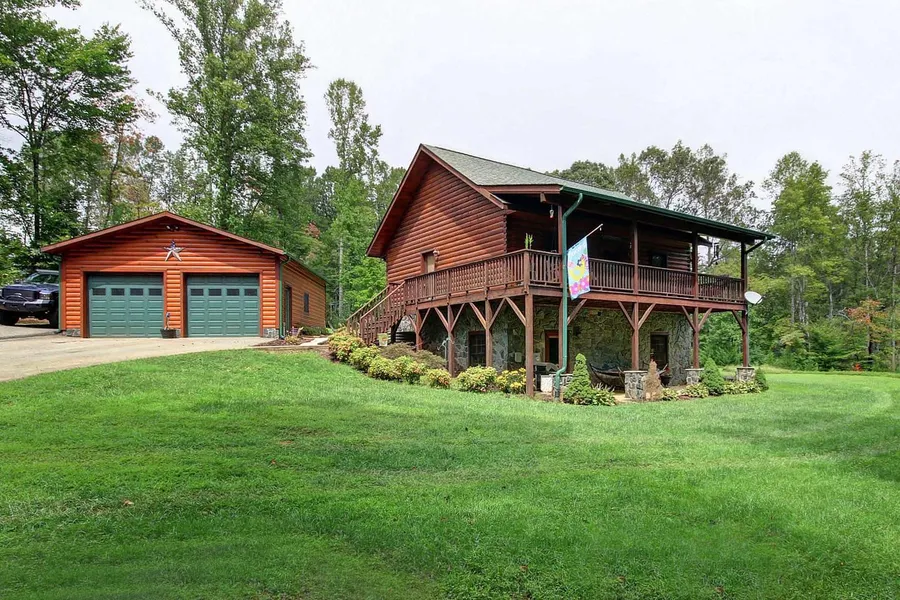 Sitting slightly on a knoll is this custom log cabin with views of the woods, and the pond. A double-sided porch with a comfortable swing forces you to unwind. The 3 bedrooms are on the lower floor, and the upper floor consists of an open space with kitchen, breakfast, 16 cathedral great room, and a den which could easily be converted to another bedroom. Logs are 8 x 6 pine and all interior walls are tongue and groove. No sheetrock. Solid hickory floors upstairs and stain free carpet down. A rare find outside of the mountains. Home has Yadtel internet and Dish for TV.