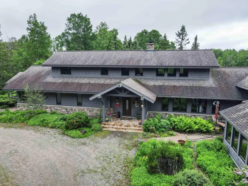 HUGE PRICE REDUCTION TO MOVE QUICKLY!! Executive Retreat! Bed & Breakfast! A place where Artists, Writers or Musicians can relax, refresh and find inspiration, or just a place to call home. So many possibilities! This warm, welcoming estate is tucked away on 120 mostly wooded acres with a 1.25-acre private pond in the backyard. The exterior is designer cedar shakes and fieldstone. The home is approximately 4000 sq ft featuring a primary bedroom with ensuite, two walk-in closets, gas fireplace and patio doors that lead to a private covered deck. There is a large second bedroom with ensuite on the main level. The third bedroom with ensuite is located on the upper level offering large closets and connected to the loft which overlooks the great room. The great room features a beautiful wood-burning fireplace and an open concept into the dining area and kitchen. Among the other amenities are a designated laundry area, a conservatory with skylights, enclosed screened porch for outside entertaining, pet den, walk-in pantry, 2 car-attached garage, guest bathroom, three fireplaces, and oak hardwood floors throughout. The basement has a fieldstone gas fireplace and is a wide-open space that can be customized to suit your needs and is already plumbed for a 5th bathroom. There is an additional 38’x48’ insulated and heated pole building with a workshop, office, and perfect place to store any recreational vehicles or toys. With numerous trails throughout the acreage and Peterson Creek flowing through the property, you will be able to enjoy the wildlife and recreation right out your front door. The home is impeccably furnished and offers a potential turn-key opportunity, furnishings negotiable. A full list of specific amenities and more features is available. There are no association fees or covenants. Located in beautiful Upper Peninsula of Michigan, this property is near many lakes, streams, golf courses, parks, and Ski Brule. This property is available for showings to Lender pre-qualified Buyers with advance appointments only. All showings accompanied by Listing Agent.