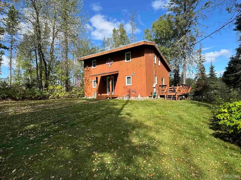Just in time for Kayaking season! Check out this cozy wood-sided cottage with over 200 feet of pristine frontage on the beautiful Michigamme River. Travel down river to "The Peavy" a 2400 acre resorvoir offering great boating, fishing & swimming. Or kayak from the Hemlock Dam down to your own property. This home sits back off the road and has a private wooded setting on just under 2 acres of land right on the river. There is an open living & dining area with a beautiful beamed knotty pine cathedral ceiling, a perfect place for gathering around the toasty pellet stove. A wall of windows overlooks the water with access to a large deck to relax and watch the river float by. Inside you'll also find a galley style kitchen, a main floor bedroom and a convenient half bath with laundry. There are two additional bedrooms upstairs connected by a Jack-and-Jill full bathroom. The property also features a 24 x25 two-car pole barn-style garage and an additional storage shed. The landscaping is well kept with a plethora of thimbleberry bushes lining the yard. Located just minutes from the nearest boat launch at Michi-Aho Resort, to take full advantage of waterfront living. Property comes equipped with a drilled well and a functioning septic system, condition/type unknown. Whether you're looking for an up-north waterfront getaway or something you could make your year round home, this affordable property is sure not to disappoint!
